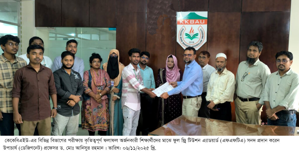 পরীক্ষায় কৃতিত্বপূর্ণ ফলাফলের অর্জনের স্বীকৃতিস্বরূপ খুলনা খান বাহাদুর আহ্ছানউল্লা বিশ্ববিদ্যালয়ের ৮ জন মেধাবী শিক্ষার্থীর মাঝে ফুল ফ্রি টিউশন অ্যাওয়ার্ড প্রদান করা হয়েছে। আজ ০৬ নভেম্বর ২০২৫ খি. তারিখ খুলনা খান বাহাদুর আহ্ছানউল্লা বিশ্ববিদ্যালয়ের কনফারেন্স রুমে বিকাল ৩:০০টায় আন্ডারগ্রাজুয়েট প্রোগ্রামের আওতায় স্প্রিং-২০২৫ সেমিস্টারের ফলাফলের ভিত্তিতে এই ফুল ফ্রি টিউশন অ্যাওয়ার্ড (এফএফটিএ) প্রদান করেন প্রধান অতিথি হিসেবে উপাচার্য (ডেজিগনেট) প্রফেসর ড. মোঃ আনিসুর রহমান। তিনি বলেন শিক্ষা জীবনে ভালো ফল অর্জন অন্যতম গুরুত্বপূর্ণ বিষয়। এর জন্য অধ্যবসায় ও অনুশীলন জরুরি। লেখাপড়ার এ সফলতার ধারা ধরে রাখার পাশাপাশি আদর্শ মানুষ হওয়ার জন্য সর্বো”চ চেষ্টা করতে হবে।