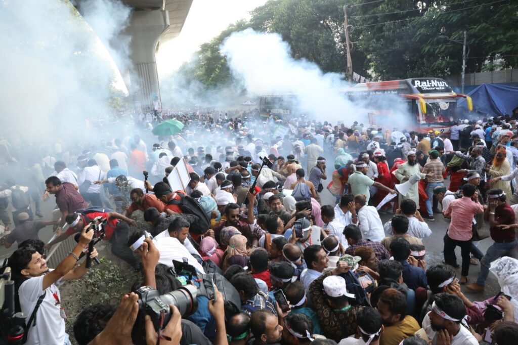 রাজধানীর শাহবাগে শনিবার (৮ নভেম্বর) বিকাল চারটায় দশম গ্রেডসহ তিন দফা দাবিতে অবস্থানরত প্রাথমিক শিক্ষকরা পুলিশের বাধার মুখে পড়েন। পুলিশ তাদের ব্যারিকেড ভাঙার চেষ্টা রোধ করতে সাউন্ড গেনেড ও জলকামান ব্যবহার করে।