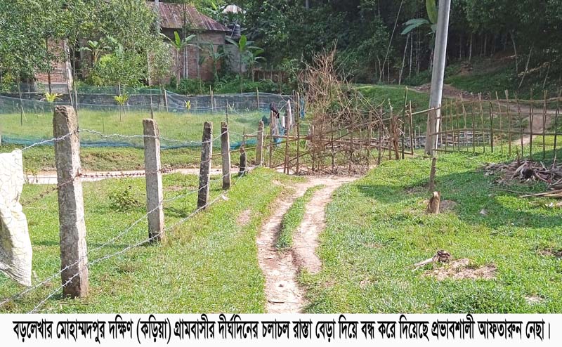 বড়লেখা উপজেলার মোহাম্মদপুর দক্ষিণ (কড়িয়া) গ্রামের ৪০ পরিবারের বাসিন্দাদের কয়েক যুগের চলাচল রাস্তায় বাঁশের বেড়া দিয়ে বন্ধ করে দিয়েছেন স্থানীয় প্রভাবশালী উশৃঙ্খল নারী আফতারুন নেছা। এতে গত ৬ দিন ধরে চরম ভোগান্তি পোয়াচ্ছেন ওই রাস্তায় চলাচলকারীরা। বিশেষ করে মারাত্মক দুর্ভোগে পড়েছে প্রাইমারী, হাইস্কুল ও মাদ্রাসার শিক্ষার্থীরা। রাস্তার প্রতিবন্ধকতা অপসারণের ব্যবস্থা নেওয়ার দাবিতে বুধবার দুপুরে ভোক্তভোগিদের পক্ষে ইউএনও বরাবরে লিখিত অভিযোগ করেছেন মোহাম্মদনগর দক্ষিণ গ্রামের আজিজুর রহমান। ইউএনও দ্রুত ব্যবস্থা নিতে সহকারি কমিশনার (ভূমি)-কে নির্দেশ দিয়েছেন। অভিযোগ সূত্র ও সরেজমিনে জানা গেছে, উপজেলার দক্ষিণ শাহবাজপুর ইউনিয়নের মোহাম্মদনগর দক্ষিণ গ্রামবাসীর চলাচলের একমাত্র রাস্তাটি আফতারুন নেছার বাড়ির পূর্ব পাশ দিয়ে দক্ষিণের সরকারি রাস্তায় সংযুক্ত। বহু বছর ধরে এ পথ দিয়েই স্থানীয়রা, শিক্ষার্থী ও রোগীরা চলাচল করে আসছেন। অন্য কোনো বিকল্প রাস্তা না থাকায় এটি এলাকাবাসীর একমাত্র যাতায়াতের পথ।