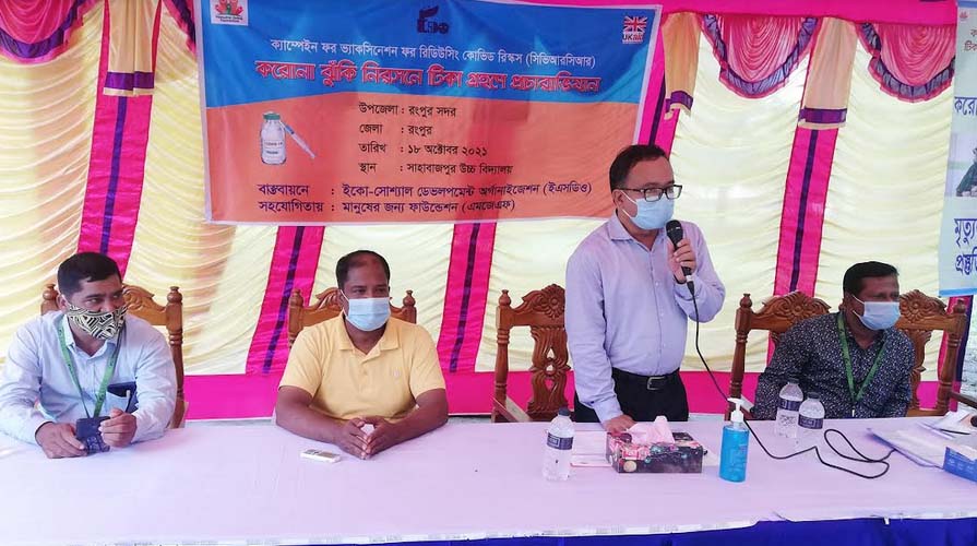রংপুর সদর উপজেলার সাহাবাজপুর উচ্চ বিদ্যালয়ে মানুষের জন্য ফাউন্ডেশন (এমজেএফ) এর সহযোগিতায় ইকো সোশ্যাল ডেভলপমেন্ট অর্গানাইজেশন (ইএসডিও) কর্তৃক আয়োজিত ৩০০জন নারী পুরুষ নিয়ে “ক্যাম্পেইন ফর ভ্যাকসিনেশন ফর রিডিউসিং কোভিড রিস্কস (সিভিআরসিআর) করোনা ঝুঁকি নিরসনে টিকা গ্রহণে প্রচারাভিযান” গত সোমবার অনুষ্ঠিত হয়। ক্যাম্পেইনের সময় ডাঃ হিরম্ব কুমার রায়,সিভিল সার্জন, রংপুর, ডাঃ রবি শঙ্কর মন্ডল, উপজেলা স্বাস্থ্য ও পরিবার পরিকল্পনা কর্মকর্তা, রংপুর সদর, মোঃ আমিনুর রহমান, চেয়ারম্যান চন্দনপাট ইউনিয়ন, মোঃ এমদাদুল হক প্রধান শিক্ষক, সাহাবাজপুর উচ্চ বিদ্যালয়, মোঃ তাজুল ইসলাম ইউপি সদস্য চন্দনপাট ইউনিয়ন, মোঃ আইয়ুব হোসেন সুজন, এপিসি, মোঃ জুলফিকার ইসলাম, এপিসি, মোঃ সাইফুল ইসলাম, জোনাল ম্যানেজার, মোঃ শাহিন হক, পিসি (এসএফটি), মোঃ হাফিজ আল আসাদ, উপজেলা প্রোগাম ম্যানেজার (ওওএসসিইপি), ইএসডিও, রংপুর এবং ইএসডিও’র অন্যান্য কর্মকর্তাবৃন্দ উপস্থিত ছিলেন। এ সময় করোনা ভ্যাকসিনেশনের জন্য ফ্রি রেজিস্ট্রেশন এবং করোনা ভ্যাকসিনেশনের উপর পট সংস ও আলোচনার মাধ্যমে সচেতনতা বৃদ্ধিসহ ৩০০জন নারী পুরুষের মাঝে কোভিড তথ্য সম্বলিত চাবির রিং, লিফলেট ও মাস্ক বিতরন করা হয়।