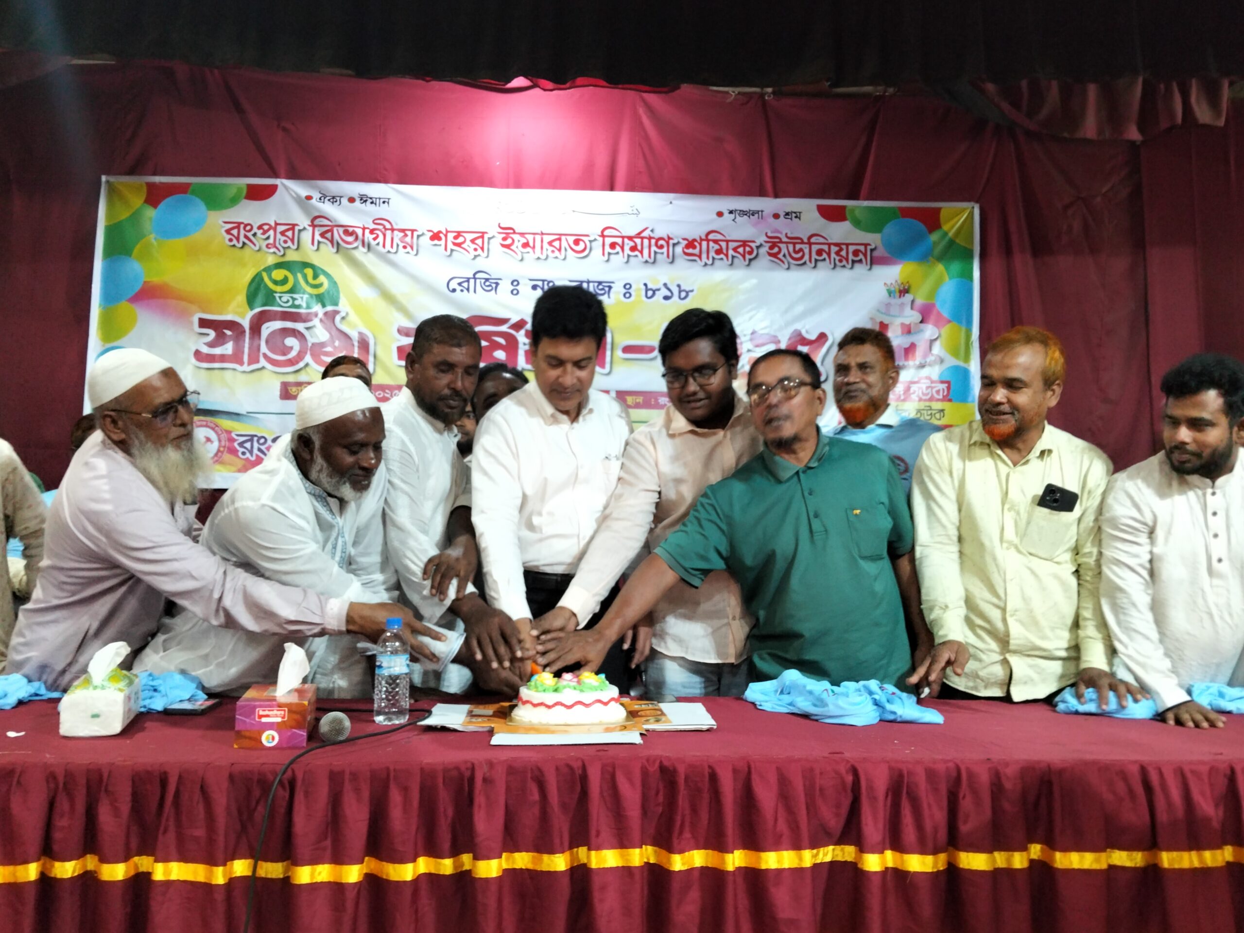 ঐক্য-ঈমান-শৃঙ্খলা-শ্রম” এই বাক্য গুলোকে মনে ধারণ করে রংপুর বিভাগীয় শহর ইমারত নির্মাণ শ্রমিক ইউনিয়ন (রেজিঃ নং- রাজ: ৮১৮) এর ৩৬ তম প্রতিষ্ঠা বার্ষিকী পালিত হয়েছে। প্রতিষ্ঠা বার্ষিকী উপলক্ষে মঙ্গলবার (১১ নভেম্বর) সকালে রংপুর বিভাগীয় শহর ইমারত নির্মাণ শ্রমিক ইউনিয়নের আয়োজনে নিজস্ব কার্যালয় হতে একটি বর্ণাঢ্য র‌্যালী নগরীর প্রধান-প্রধান সড়ক প্রদক্ষিণ শেষে টাউন হল চত্বরে শেষ হয়, পরে টাউন হলে আলোচনা সভা ও কেক কাটা হয়।