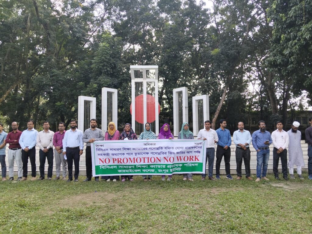 শিক্ষা-অধিকার-সমতা এই বাক্যগুলোকে মনে ধারণ করে বিসিএস সাধারণ শিক্ষা ক্যাডারের পদোন্নতি বঞ্চিত যোগ্য প্রভাষকদের সহকারী অধ্যাপক পদে ভূতাপেক্ষ পদোন্নতির জিও জারির আগ পর্যন্ত “নো প্রমোশন, নো ওয়ার্ক” কর্মসূচি পালন করছেন। এরই অংশ হিসেবে রোববার (১৬ নভেম্বর) দুপুরে বিসিএস সাধারণ শিক্ষা ক্যাডার প্রভাষক পরিষদ কারমাইকেল কলেজ, রংপুর ইউনিটের আয়োজনে কারমাইকেল কলেজ শহিদ মিনার চত্বরে দাড়িয়ে “নো প্রমোশন, নো ওয়ার্ক” কর্মসূচি পালন করেন।