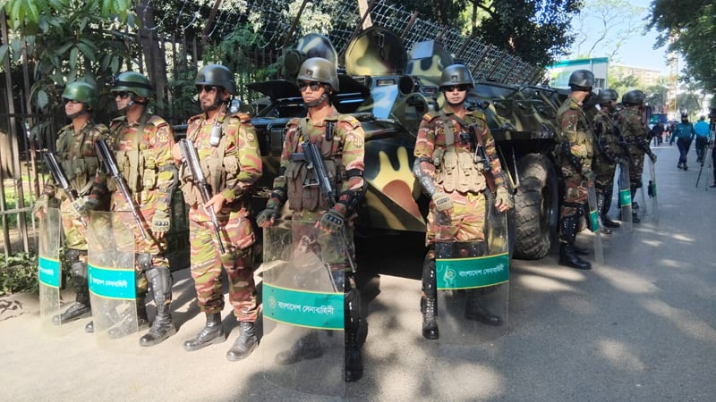 সুপ্রিম কোর্ট এলাকায় চারদিক ঘিরে কঠোর নিরাপত্তা বলয় তৈরি করা হয়েছে। গেটের সামনে সেনাবাহিনী মোতায়েন থাকতে দেখা গেছে। ট্রাইব্যুনালের ভেতর–বাইরে পুলিশ, র্যাব ও অন্যান্য বাহিনীর উপস্থিতি বাড়ানো হয়েছে।