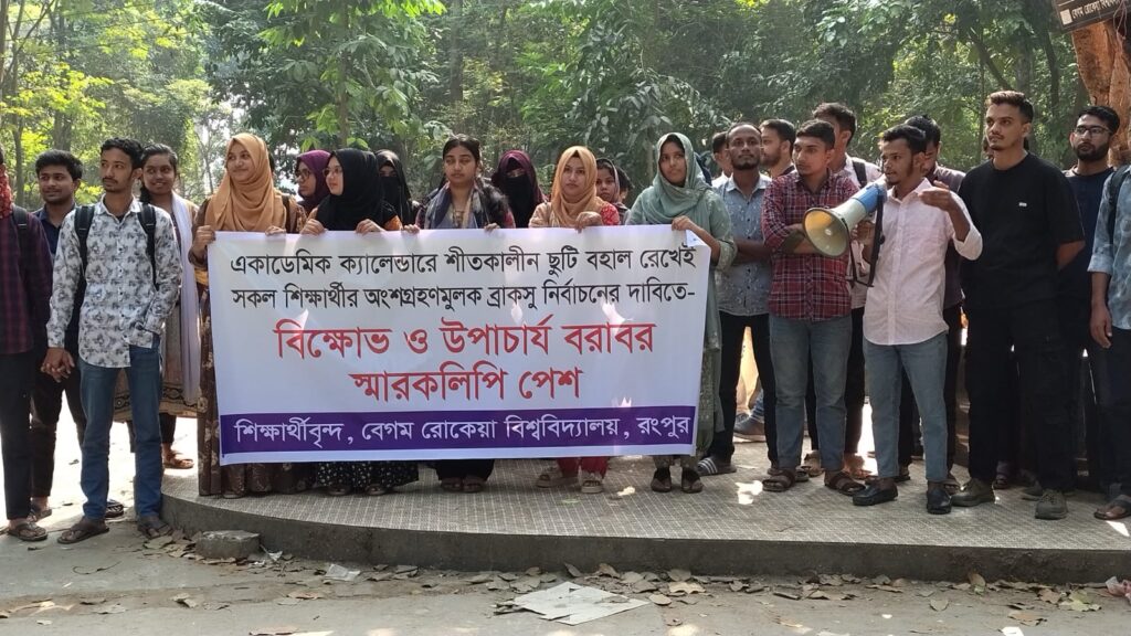রংপুরের বেগম রোকেয়া বিশ্ববিদ্যালয় (বেরোবি) নির্ধারিত সময়ে ছুটি চেয়ে বিক্ষোভ করেছে সাধারণ শিক্ষার্থীরা।