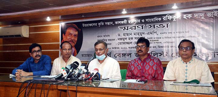 তথ্য ও সম্প্রচার মন্ত্রী ড. হাছান মাহমুদ বলেছেন, দেশে জঙ্গিবাদ কমে যাবে যদি আমরা শিশুদের প্রতিভা বিকশিত করতে পারি। তাদেরকে উপযুক্ত শিক্ষা দিতে পারি। শিশু সংগঠক, ছড়াকার ও সাংবাদিক রফিকুল হক দাদু ভাইয়ের স্মরণ সভায় এসব কথা বলেন তিনি। শুক্রবার (২২ অক্টোবর) বেলা ১১টায় ঢাকা রিপোর্টার্স ইউনিটির স্বাধীনতা হলে এই স্মরণ সভার আয়োজন করে নর্থ বেঙ্গল জার্নালিস্ট ফোরাম (এনবিজেএফ), ঢাকা। স্মরণ সভায় প্রধান অতিথির বক্তব্যে ড. হাছান বলেন, দাদু ভাই তার কাজের প্রতি একনিষ্ঠ ও দায়িত্বশীল ছিলেন। তিনি শিশুদের নিয়ে কাজ করেছেন। তাই তিনি বেশি শ্রদ্ধার পাত্র। তিনি বলেন, অনেকেই শিশু সংগঠক হিসেবে কাজ করছেন, জড়িত রয়েছেন। তাদের বিকাশের জন্য কাজ করছেন কিন্তু শিশুদের জন্য এখন কাগজে তেমন কিছু দেখা যায় না। তাই সাংবাদিক, মালিকসহ সবাইকে সংবাদপত্রে শিশুদের পাতাটি চালুর অনুরোধ জানাচ্ছি। তথ্যমন্ত্রী বলেন, বাংলাদেশ টেলিভিশনে শিশুদের জন্য নতুন কুড়িসহ বিভিন্ন অনুষ্ঠান বন্ধ হয়ে গেছে। সেগুলো নতুন করে চালু করবো। এনবিজেএফ-এর সাধারণ সম্পাদক তোফাজ্জল হোসেনের সঞ্চালনায় স্মরণ সভায় আরও উপস্থিত ছিলেন সংগঠনটির সিনিয়র সহ-সভাপতি নজমুল হক সরকার, বাংলাদেশ ফেডারেল সাংবাদিক ইউনিয়নের সাবেক সাধারণ সম্পাদক এম এ আজিজ, ঢাকা সাংবাদিক ইউনিয়নের সাধারণ সম্পাদক সাজ্জাদ আলম খান তপুসহ এনবিজেএফ এর সদস্যরা। প্রসঙ্গত, ‘দাদু ভাই’ হিসেবে পরিচিতি পাওয়া শিশু সাহিত্যিক, নাট্যকার ও সাংবাদিক রফিকুল হক গত ১০ অক্টোবর ৮৪ বছর বয়সে মারা যান। ১৯৩৭ সালের ৮ জানুয়ারি জন্ম নেওয়া রফিকুল হকের গ্রামের বাড়ি রংপুরের কামাল কাছনায়। তিনি সবশেষ দৈনিক যুগান্তরের ফিচার এডিটর হিসেবে কর্মরত ছিলেন।