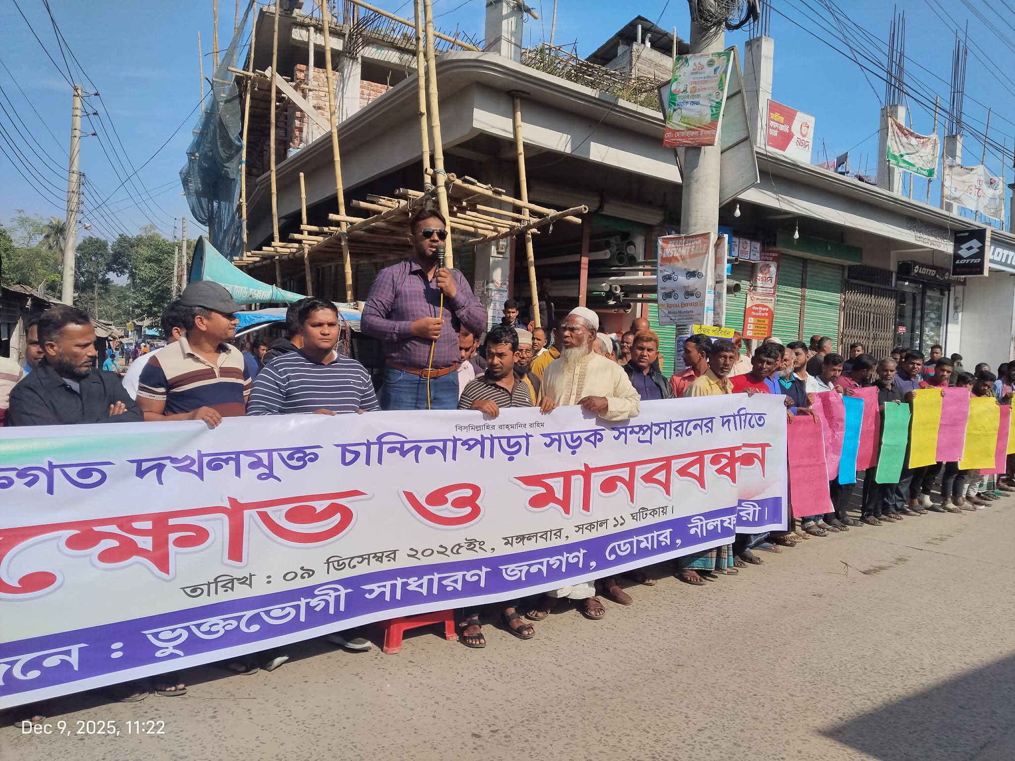 মঙ্গলবার (৯ ডিসেম্বর) দুপুরে ডোমার পৌরশহরের ডিবি মোড় থেকে চান্দিনাপাড়া মোড় পর্যন্ত সড়কের দুই ধারে কয়েকশ মানুষ ‘ভুক্তভোগী সাধারণ জনগণ’ ব্যানারে একঘণ্টাব্যাপী মানববন্ধনে অংশ নেন। অংশগ্রহণকারীরা জানান, ১৫৫ মিটার দৈর্ঘ্য ও ১৩ ফুট প্রস্থের এই সড়কটি ডোমার পৌর এলাকা ছাড়াও আশপাশের কয়েকটি ইউনিয়নের হাজারো মানুষের প্রধান চলাচলের পথ। সড়কটি ব্যবহার করে একটি কলেজ, তিনটি মাধ্যমিক বিদ্যালয়, পাঁচটি সরকারি প্রাথমিক বিদ্যালয়, দশটি মাদ্রাসা ও একটি সরকারি ক্লিনিকসহ নানা প্রতিষ্ঠানে প্রতিদিন কয়েক হাজার মানুষ যাতায়াত করেন।