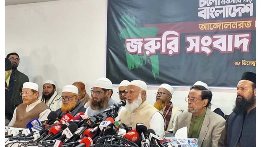 সংবাদ সম্মেলনে নতুন সদস্যদলগুলোর নাম ঘোষণা করেন জামায়াতে ইসলামের আমির ডা. শফিকুর রহমান।