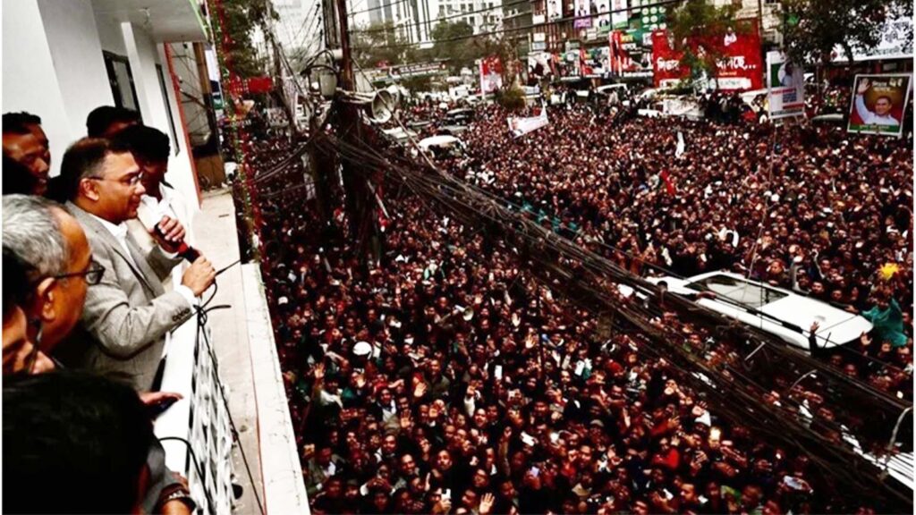 এসময় নেতাকর্মীরা তারেক রহমানকে স্বাগত জানিয়ে স্লোগান দিতে থাকেন— তারেক রহমান বীরের বেশে, আসছে ফিরে বাংলাদেশে; তারেক রহমানের আগমন, শুভেচ্ছা স্বাগতম; তারেক রহমান এসেছে, রাজপথ হাসছে; বাংলাদেশের প্রাণ, তারেক রহমান।
