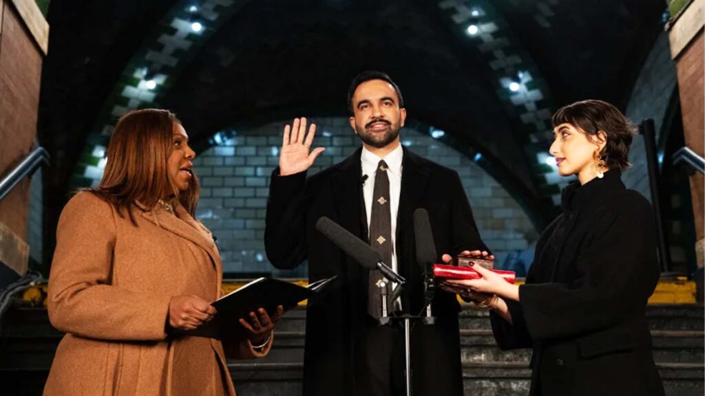 নিউইয়র্কের স্থানীয় সময় বুধবার গভীর রাতে শপথ গ্রহণ করেছেন জোহরান মামদানি। এর মাধ্যমে তিনি যুক্তরাষ্ট্রের এই শহরের ইতিহাসে প্রথম মুসলিম মেয়র হিসেবে দায়িত্ব নিলেন। শপথ গ্রহণকালে তিনি এক হাত উঁচু করে অন্য হাত পবিত্র কোরআনের ওপর রাখেন।