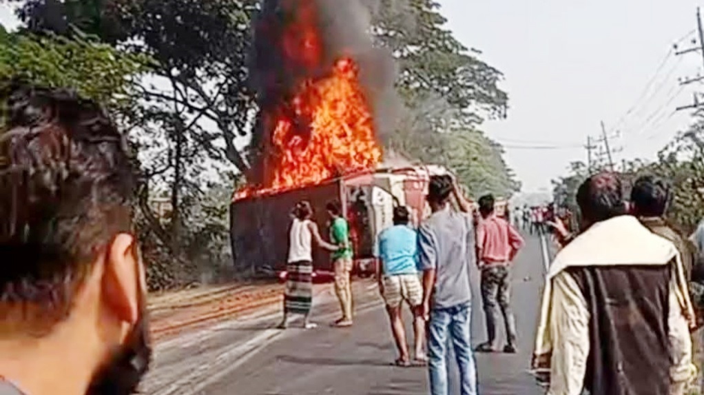 দাউদকান্দি হাইওয়ে থানার ভারপ্রাপ্ত কর্মকর্তা (ওসি) ইকবাল বাহার মজুমদার বিষয়টি নিশ্চিত করে জানান, মোটরসাইকেল ও সিএনজির সঙ্গে সংঘর্ষের পর পুরো বাসে আগুন ছড়িয়ে পড়ে। ফায়ার সার্ভিস আগুন নিয়ন্ত্রণে আনার পর ঘটনাস্থল থেকে একজন নারী, একজন পুরুষ ও দুই শিশুর মরদেহ উদ্ধার করা হয়।