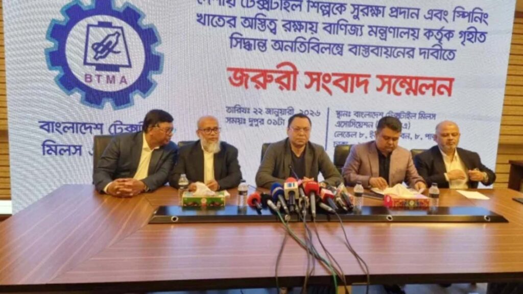 আগামী ১ ফেব্রুয়ারি থেকে অনির্দিষ্টকালের জন্য দেশের সব টেক্সটাইল মিল বন্ধ রাখার ঘোষণা দিয়েছে বাংলাদেশ টেক্সটাইল মিলস অ্যাসোসিয়েশন (বিটিএমএ)। সুতা উৎপাদনকারী মিলগুলোকে টিকিয়ে রাখতে সরকার কার্যকর কোনো পদক্ষেপ নেয়নি—এ অভিযোগ তুলে এ সিদ্ধান্তের কথা জানায় সংগঠনটি।