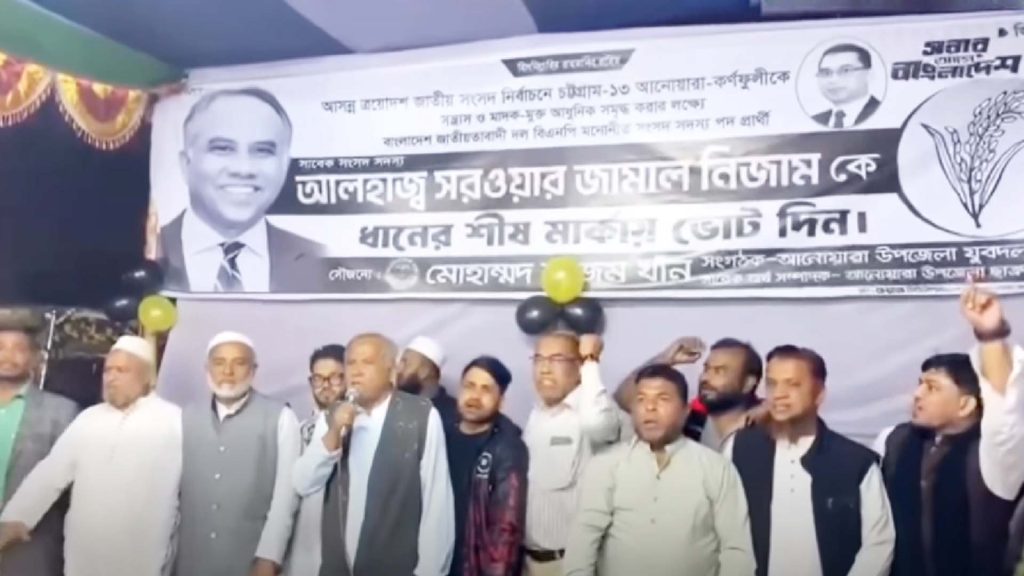 আসন্ন ১২ ফেব্রুয়ারির জাতীয় নির্বাচনকে কেন্দ্র করে চট্টগ্রাম-১৩ (আনোয়ারা ও কর্ণফুলী) আসনের বিএনপি মনোনীত প্রার্থী ও সাবেক সংসদ সদস্য সরওয়ার জামাল নিজামের একটি ভিডিও সামাজিক যোগাযোগমাধ্যমে ব্যাপক আলোচনার জন্ম দিয়েছে। ভিডিওতে তাঁকে প্রকাশ্য জনসভায় দুই হাত জোড় করে ভোটের দিন পর্যন্ত চাঁদাবাজি বন্ধ রাখার অনুরোধ জানাতে দেখা গেছে।
