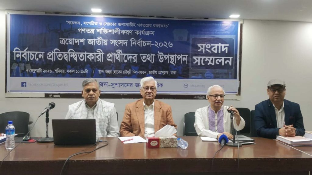 শনিবার (৭ ফেব্রুয়ারি) জাতীয় প্রেসক্লাবে আয়োজিত “নির্বাচনে প্রতিদ্বন্দ্বিতাকারী প্রার্থীদের তথ্য উপস্থাপন” শীর্ষক সংবাদ সম্মেলনে এসব তথ্য তুলে ধরা হয়। তথ্য উপস্থাপন করেন সুজনের কেন্দ্রীয় সমন্বয়ক দিলীপ কুমার সরকার। এ সময় উপস্থিত ছিলেন সংগঠনের প্রধান নির্বাহী বদিউল আলম মজুমদার, কোষাধ্যক্ষ সৈয়দ আবু নাসের বখতিয়ার আহমেদসহ অন্যান্য নেতারা।