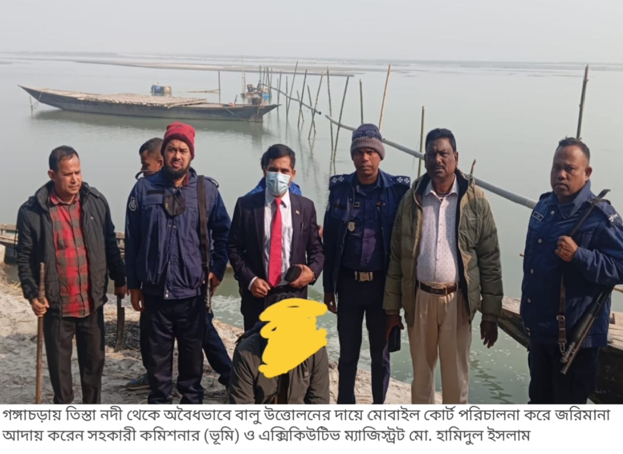 রংপুরের গঙ্গাচড়ায় তিস্তা নদী থেকে অবৈধভাবে বালু উত্তোলনের দায়ে মোবাইল কোর্ট পরিচালনা করে একজনের ৫০ হাজার টাকা জরিমানা করা হয় এবং মুচলেকা গ্রহন করা হয়েছে। এছাড়া বালু উত্তোলনে ব্যবহৃত সামগ্রী বিনষ্ট করা হয়। উপজেলার আলমবিদিতর ইউনিয়নের পাইপান পীরপাড়া গ্রামে এবং নোহালী ইউনিয়নের কচুয়া বাজারে শনিবার সকাল সাড়ে ৬ টায় সহকারী কমিশনার (ভূমি) ও এক্সিকিউটিভ ম্যাজিস্ট্রেট মো. হামিদুল ইসলাম মোবাইল কোর্ট পরিচালনা করে অনুমতি ব্যতীত বালু উত্তোলনের অপরাধে একজনকে বালু মহাল ও মাটি ব্যবস্থাপনা আইন ২০১০ এর আওতায়  ৫০ হাজার টাকা অর্থদণ্ড প্রদান এবং মুচলেকা গ্রহণ করেন। এ সময় অধিকন্তু বালু উত্তোলনের সঙ্গে সংশ্লিষ্ট অন্যান্য সামগ্রী বিনষ্ট করা হয় এবং উপস্থিত সকলকে অনুমতি ব্যতীত বালু উত্তোলন না করার জন্য সচেতন এবং সর্তক করা হয়। মোবাইল কোর্ট পরিচালনাকালে নোহালী ইউপি চেয়ারম্যান আশরাফ আলীসহ পুলিশ সদস্যরা উপস্থিত ছিলেন। সহকারী কমিশনার (ভূমি) ও এক্সিকিউটিভ ম্যাজিস্ট্রেট মো. হামিদুল ইসলাম জানান, জনস্বার্থে এ রকমের অভিযান অব্যাহত থাকবে।