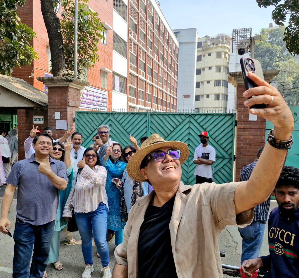 গুলশান মানারাত স্কুল এন্ড কলেজ কেন্দ্রে ভোট প্রদানের পর আনন্দে সেলফি তুলছেন কয়েকজন/ ছবি: মঈন আহমেদ