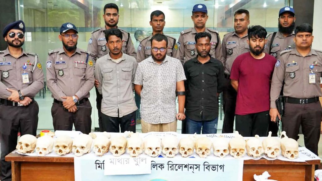 সোমবার রাতে রাজধানীর তেজগাঁওয়ের মণিপুরীপাড়া, তেজগাঁও কলেজ এলাকা ও উত্তরা থেকে ফয়সাল, সৌমিকসহ মোট ছয়জনকে গ্রেপ্তার করেছে পুলিশ। এ সময় তাদের কাছ থেকে ৪৭টি মাথার খুলি এবং বিপুল পরিমাণ মানবদেহের হাড় ও কঙ্কাল উদ্ধার করা হয়।