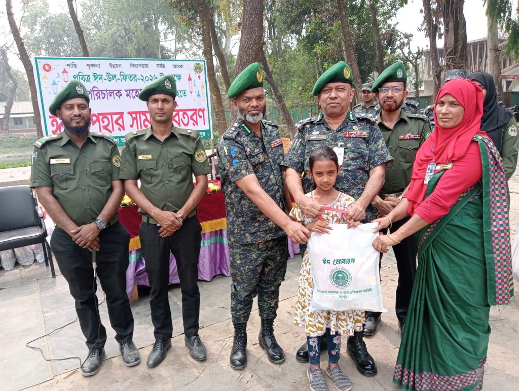 রংপুরে আনসার ভিডিপির ঈদ উপহার সামগ্রী বিতরণ করেছে । বুধবার নগরীর মাহিগঞ্জ আনসার ও ভিডিপির প্রশিক্ষণ কেন্দ্রে বাংলাদেশ আনসার ও গ্রাম প্রতিরক্ষা বাহিনীর মহাপরিচালকের উদ্যোগে আনসার- ভিডিপির ইউনিয়ন,ওয়ার্ড দলনেতা, দলনেত্রী , আনসার কমান্ডারদের মাঝে ঈদ উপহার হিসেবে খাদ্য সামগ্রী বিতরণ করেন রংপুর রেঞ্জের রেঞ্জ উপমহাপরিচালক মোহাম্মদ আবদুল আউয়াল । ঈদ উপহার সামগ্রী হিসেবে আনসার – ভিডিপি সদস্যদের প্রতি জনকে ১ কেজি পোলাও এর চাউল, ১ কেজি চিনি, ১ লিটার সয়াবিন তেল, ২ প্যাকেট লাচ্ছা সেমাই, ২প্যাকেট সাধারণ সেমাই, ৫০০ গ্রাম সুজি, ১প্যাকেট গুড়ো দুধ,ও লুডুস ইত্যাদি খাদ্য সামগ্রী বিতরণ করা হয়। প্রধান অতিথি উপমহাপরিচালক আবদুল আউয়াল এ সময় ক্ষুধা মুক্ত, দারিদ্র্যমুক্ত, অপরাধ মুক্ত, শৃঙ্খলা রক্ষায় স্বপ্নের নতুন সোনার বাংলাদেশ গড়ার জন্য কাঁধে কাঁধ মিলিয়ে কাজ করার জন্য এবং দেশের উন্নয়নে গতিকে অব্যাহত ও আরো গতিশীল করতে সকলকে নিবেদিত হয়ে কাজ করার আহ্বান জানান।