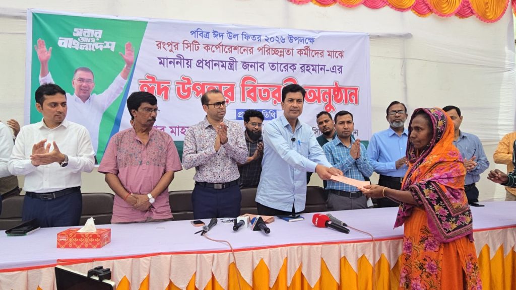 পবিত্র ঈদ উল ফিতর উপলক্ষে রংপুর সিটি কর্পোরেশনের(রসিখ) পরিচ্ছন্নতা কর্মীদের মাঝে প্রধানমন্ত্রী তারেক রহমান-এর দেয়া ঈদ উপহার হিসেবে নগদ ৫ হাজার করে টাকা বিতরণ করা হয়েছে। রসিকে মোট ৮৫৫ জন পরিচ্ছন্নতা কর্মীর প্রত্যেককে ঈদ উপহার হিসেবে ৫ হাজার টাকা করে মোট ৪২ লক্ষ ৭৫ হাজার টাকা প্রদান করা হয়।
