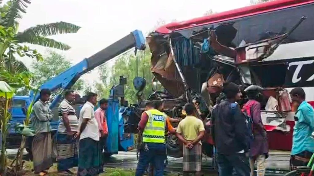পুলিশ ও স্থানীয় সূত্রে জানা যায়, পঞ্চগড় থেকে ঢাকাগামী হেরিটেজ ট্রাভেলস নামের একটি যাত্রীবাহী বাস সড়কের পাশে দাঁড়িয়ে থাকা একটি ট্রাককে সজোরে ধাক্কা দেয়। এতে বাস ও ট্রাকের সামনের অংশ দুমড়ে-মুচড়ে যায়। ঘটনাস্থলেই বাসের হেলপার ও এক যাত্রী নিহত হন।