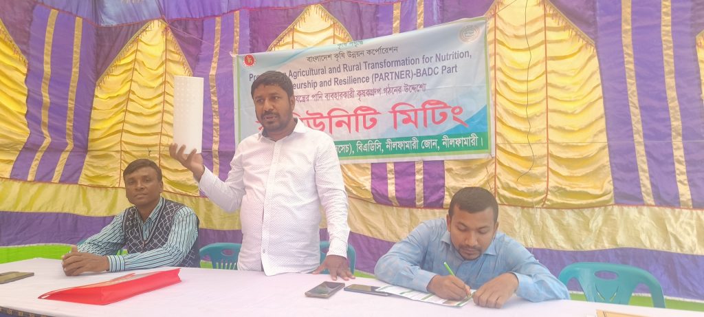 কমিউনিটি মিটিংয়ে উপস্থিত থেকে বক্তব্য রাখেন বিএডিসি নীলফামারীর সহকারী প্রকৌশলী মোঃ মোসফিকুর রহমান, উপসহকারী প্রকৌশলী মোঃ ফারুক হোসেন এবং কর্মকর্তা মোঃ শাহিন ফেরদৌস। বক্তারা কৃষকদের মাঝে আধুনিক সেচ ব্যবস্থাপনা, পানি ব্যবহারে দক্ষতা বৃদ্ধি এবং দলগতভাবে কাজ করার গুরুত্ব তুলে ধরেন।