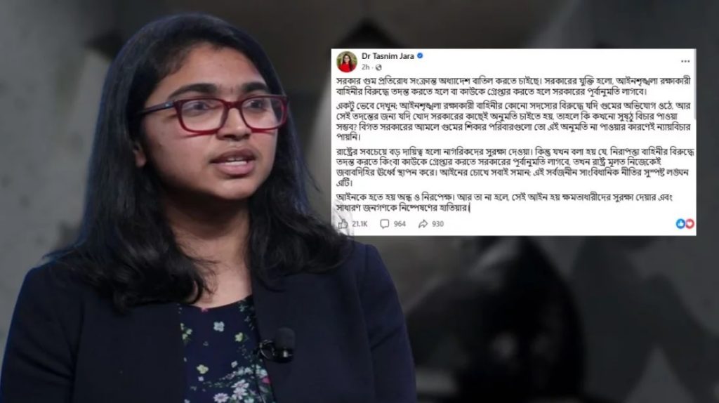তাসনিম জারা বলেন, রাষ্ট্রের সবচেয়ে বড় দায়িত্ব নাগরিকদের নিরাপত্তা নিশ্চিত করা। কিন্তু যখন বলা হয় নিরাপত্তা বাহিনীর বিরুদ্ধে তদন্ত বা গ্রেপ্তারের আগে সরকারের অনুমতি নিতে হবে, তখন রাষ্ট্র নিজেকেই জবাবদিহির ঊর্ধ্বে স্থাপন করে। তিনি মনে করেন, এটি আইনের চোখে সবাই সমান—এই মৌলিক সাংবিধানিক নীতির সুস্পষ্ট লঙ্ঘন।