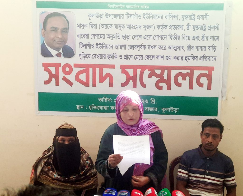 কুলাউড়ায় প্রতারণা, জোরপূর্বক সম্পত্তি দখল, অনুমতি ছাড়া দ্বিতীয় বিয়ে, বাড়ি ঘর পুড়িয়ে দেয়া, প্রাণনাশের হুমকি ও গুম করার অভিযোগ এনে যুক্তরাষ্ট্র প্রবাসী স্বামী মোহাম্মদ মাসুক আহমদের বিরুদ্ধে সংবাদ সম্মেলন করেছেন যুক্তরাষ্ট্র প্রবাসী রাবেয়া বেগম নামের এক ভুক্তভোগী নারী। ৪ এপ্রিল শনিবার বিকেল ৪টায় কুলাউড়া পৌরশহরের মুক্তিযোদ্ধা কমপ্লেক্সে আয়োজিত সংবাদ সম্মেলনে লিখিত বক্তব্যে রাবেয়া বেগম অভিযোগ করে বলেন, আমি কুলাউড়া উপজেলার টিলাগাঁও ইউনিয়নের ছালামতপুর গ্রামের বাসিন্দা আব্দুল হান্নানের মেয়ে। ২০০৩ সালের ২০ আগস্ট একই ইউনিয়নের লালপুর গ্রামের মোহাম্মদ আহমদ উল্লার ছেলে মোহাম্মদ মাসুক আহমদের সাথে ৪০ লক্ষ টাকা দেনমোহরে আমার বিবাহ হয়। বিয়ের পর আমি আমার স্বামী মাসুক আহমদকে যুক্তরাষ্ট্রে আনি। সেখানে তাকে আমি প্রতিষ্ঠিত করাই। দেশে অনেক সম্পত্তি যৌথ ক্রয় করি। আমার মাধ্যমে স্বামী যুক্তরাষ্ট্রে প্রতিষ্ঠিত হবার পর তিনি তার সৎ মা আলতারুন বেগম, ভাই আজিজুর রহমান জীবন, বোন মাছুমা আক্তার জুলি ও উপমা আক্তার ঝুনিকে যুক্তরাষ্ট্রে নেন। বেশ কিছুদিন আমাদের সংসার ভালোই চলছিলো। বিয়ের পর আমার স্বামীর কথায় আমার প্রথম বাচ্চা নষ্ট করি। এরপর সন্তান নেয়ার চেষ্টা করলেও আর সন্তান হয়নি। একাধিক চিকিৎসা করাই। তিনটি জটিল অপারেশনও করাই। একপর্যায়ে আমার স্বামীর কারণে সংসারে নানা অশান্তি নেমে আসে। এরপর আমার স্বামী যুক্তরাষ্ট্র থেকে ঘন ঘন দেশে আসা শুরু করেন। একপর্যায়ে তার আসল চেহারা প্রকাশ পায়। বিয়ের পর থেকে নানা বিষয় নিয়ে যুক্তরাষ্ট্রে আমার স্বামী আমার ওপর বিভিন্ন সময় মানসিক নির্যাতন থেকে শুরু করে শারীরিকভাবে মারধরও করেন। তাঁর বিতর্কিত সকল কর্মকান্ডের কারণে আমাদের ২৪ বছরের সংসার অশান্তি নেমে আসে। তিনি নানা ছলচাতুরীর আশ্রয় নিয়ে দেশে ফিরে আমাদের দুইজনের যৌথ সমস্ত সম্পত্তি আত্মসাৎ করে এককভাবে তাঁর দখলে নিয়েছেন।