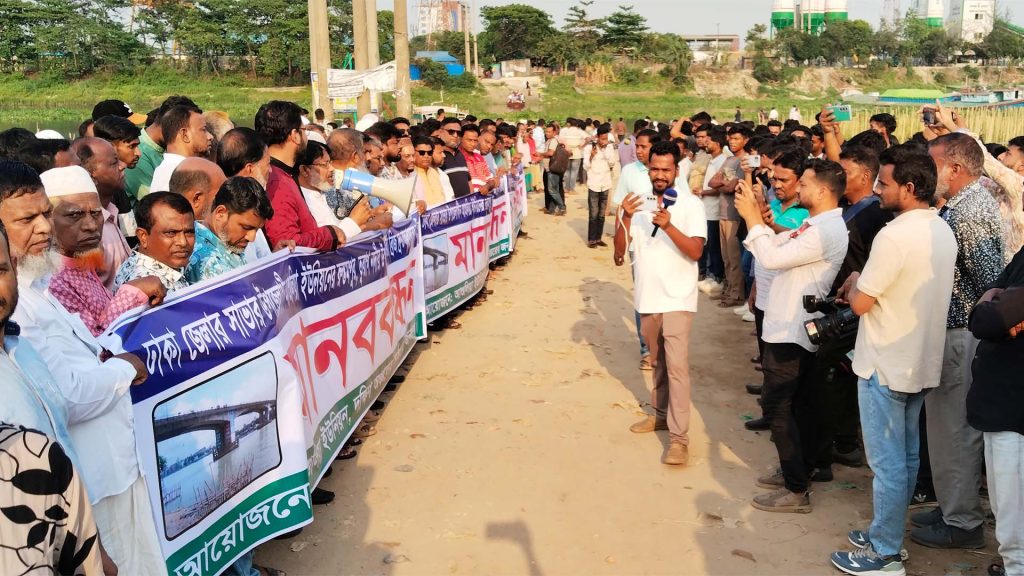 আশুলিয়ার রুস্তমপুর এলাকায় নদীর উপর ব্রিজ নির্মাণের দাবিতে মানববন্ধন কর্মসূচি পালন করেছেন স্থানীয় এলাকাবাসী। সোমবার বিকেলে নদীর তীরে আয়োজিত এই মানববন্ধনে অংশ নেন বিভিন্ন শ্রেণি-পেশার মানুষ।
