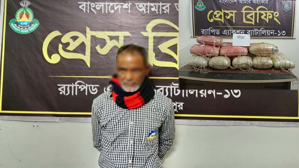 কুড়িগ্রামে মাদকবিরোধী অভিযানে এক মাদক ব্যবসায়ী গ্রেফতারসহ মাদক জব্দ করা হয়েছে। র্যাবের চলমান মাদকবিরোধী অভিযানের ধারাবাহিকতায় রবিবার ভোর পৌনে ৫ টায় র্যাব-১৩, সদর কোম্পানী, রংপুর এর একটি আভিযানিক দল গোপন সংবাদের ভিত্তিতে এ অভিযান পরিচালনা করে। এতে জেলার ফুলবাড়ী উপজেলার ১নং নাওডাঙ্গা ইউনিয়নের পূর্ব ফুলবাড়ী গ্রামের জনৈক আতিকুর রহমান নয়ন (৫০) এর নিজ বসতবাড়িতে অভিযান পরিচালনা করে তার বাড়ির নিজ ঘরের খাটের নীচ থেকে ৭৬ কেজি গাঁজা জব্দসহ মাদক ব্যবসায়ী মোঃ আতিকুর রহমান নয়ন (৫০)কে গ্রেফতার করা হয়। রংপুর র্যাব-১৩ এর সিনিয়র সহকারী পরিচালক (মিডিয়া) ও অতিরিক্ত পুলিশ সুপার বিপ্লব কুমার গোস্বামী আজ রবিবার দুপুরে এক প্রেস বিজ্ঞপ্তির মাধ্যমে নিশ্চিত করেন। গ্রেফতার কৃত আতিকুর রহমান নয়ন ফুলবাড়ী উপজেলার নাওডাঙ্গা ইউনিয়নের পূর্ব ফুলমতি গ্রামের মৃত ফজলুল হকের ছেলে।