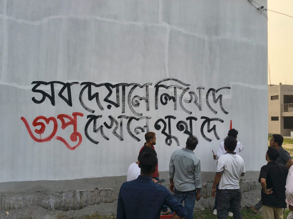 এ সময় ছাত্রদলের নেতাকর্মীরা লাল-কালো রঙ দিয়ে বিভিন্ন প্রতিবাদী স্লোগান দেয়ালে ফুটিয়ে তোলেন। স্লোগানগুলোর মধ্যে উল্লেখযোগ্য ছিল– “সব দেয়ালে লিখে দে, গুপ্ত দেখলে থুতু দে”, “গুপ্ত মুক্ত হল”, “দড়ি ধরে মারো টান, গুপ্ত হবে খান খান”, “শিক্ষা-সন্ত্রাস একসাথে চলে না” এবং “গুপ্তদের প্রবেশ নিষেধ”।