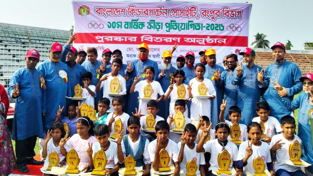 উল্লেখ্য- বাংলাদেশ কিন্ডারগার্টেন সোসাইটির আয়োজিত অনুষ্ঠিতব্য ১০ম ক্রীড়া প্রতিযোগিতায় রংপুর মহানগর ছাড়াও ৮ জেলার কিন্ডারগার্টেন সোসাইটির ২১৬ জন শিক্ষার্থীর অংশগ্রহনে ১২ টি ইভেন্টে মোট ৩৬জন ১ম, ২য় ও ৩য় স্হান অধিকারীদের মাঝে পুরস্কার বিতরণ করা হয়।