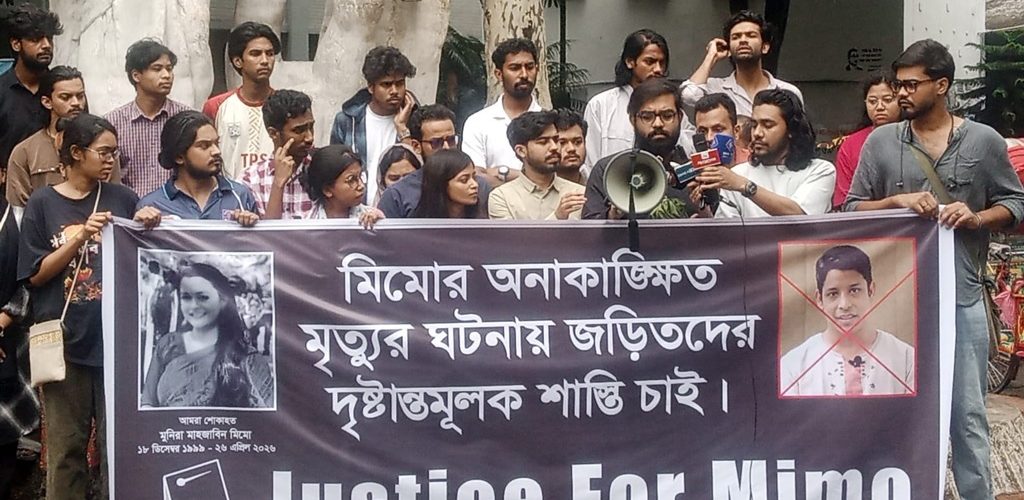 ঢাকা বিশ্ববিদ্যালয়ের থিয়েটার অ্যান্ড পারফরম্যান্স স্টাডিজ বিভাগের শিক্ষার্থী মুনিরা মাহজাবিন মিমোর অনাকাঙ্ক্ষিত মৃত্যুর ঘটনায় বিচার দাবিতে মানববন্ধন করেছে সহপাঠীরা। একইসঙ্গে বিভাগে চলমান নিপীড়ন বন্ধসহ সাত দফা দাবিতে অনির্দিষ্টকালের জন্য সব ক্লাস ও পরীক্ষা বর্জনের ঘোষণা দেওয়া হয়েছে।