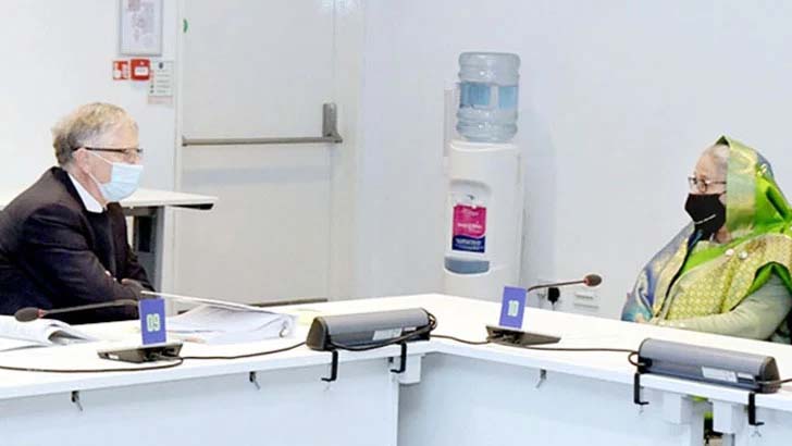 প্রধানমন্ত্রী শেখ হাসিনার সঙ্গে সৌজন্য সাক্ষাৎ করেছেন বিশ্বসেরা প্রযুক্তি জায়ান্ট মাইক্রোসফটের প্রতিষ্ঠাতা বিল গেটস। গত সোমবার স্কটল্যান্ডের গ্লাসগোতে বিশ্ব জলবায়ু সম্মেলন (কপ-২৬) কেন্দ্রের মিটিং রুমে এ সাক্ষাৎ হয়। তাদের সাক্ষাতের ছবি প্রকাশ করেছে তথ্য অধিদপ্তর (পিআইডি)। ছবিতে পররাষ্ট্রমন্ত্রী এ কে আবদুল মোমেনকে প্রধানমন্ত্রীর সঙ্গে দেখা যায়। তবে প্রধানমন্ত্রী ও বিল গেটসের কী নিয়ে আলোচনা হয়েছে, সে বিষয়ে তাৎক্ষণিকভাবে কিছু জানা যায়নি। বর্তমানে জলবায়ু পরিবর্তনের প্রভাব মোকাবিলার ওপর গুরুত্ব দিচ্ছেন বিল অ্যান্ড মেলিন্ডা গেটস ফাউন্ডেশনের প্রতিষ্ঠাতা ও বিশ্বের সেরা ধনীদের তালিকায় থাকা বিল গেটস। এদিকে প্রধানমন্ত্রী শেখ হাসিনা কপ-২৬ সম্মেলনের ভাষণে বলেন, জলবায়ু পরিবর্তনের ভয়াবহ বিপর্যয় থেকে বিশ্বকে বাঁচাতে প্যারিস চুক্তি বাস্তবায়নের বিকল্প নেই। জলবায়ু অভিবাসীদের লোকসান-ক্ষয়ক্ষতির সমাধান অবশ্যই করতে হবে। এ ক্ষেত্রে কমনওয়েলথ ও ক্লাইমেট ভালনারেবল ফোরামকে (সিভিএফ) একসঙ্গে কাজ করার আহ্বান জানান তিনি। ‘অ্যাকশন অ্যান্ড সলিডারিটি- ক্রিটিক্যাল ডিকেড’ শীর্ষক সভায় প্রধানমন্ত্রী জানান, অর্থ ও শক্তিশালী রাজনৈতিক সদিচ্ছার অভাবে বৈশ্বিক জলবায়ু কার্যক্রম কার্যকর হচ্ছে না। এসময় তিনি উল্লেখ করেন ক্ষতিগ্রস্ত দেশগুলোর প্রতি উন্নত দেশগুলোর সমর্থন ও সহায়তা প্রয়োজন। রোববার স্কটল্যান্ডের গ্লাসগোয় শুরু হয়েছে বিশ্ব জলবায়ু সম্মেলন (কপ-২৬)। এ সম্মেলন চলবে ১২ নভেম্বর পর্যন্ত।