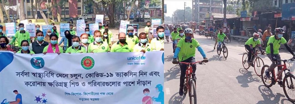 “সর্বদা স্বাস্থ্যবিধি মেনে চলুন, কোভিড-১৯ ভ্যাকসিন নিন এবং করোনায় ক্ষতিগ্রস্থ শিশু ও পরিবারগুলোর পাশে দাঁড়ান” এ প্রত্যাশা ও দাবীকে সামনে রেখে শিশু-কিশোর-কিশোরীদের স্বেচ্ছাসেবী সংগঠন ‘সবুজের স্বপ্ন জয়’ ইউনিসেফ এর ব্যবস্থাপনায় এবং রংপুর সিটি কর্পোরেশনের সহায়তায় শুক্রবার (৫ নভেম্বর) রংপুর মহানগরীতে সাইকেল র্যালী অনুষ্ঠিত হয়। র্যালীটি নগরীর টাউন হল চত্বর থেকে বের হয়ে নগরীর প্রধান প্রধান সড়ক প্রদক্ষিণ করে।