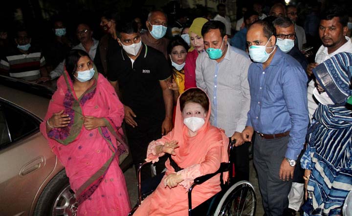 রাজধানীর এভারকেয়ার হাসপাতালে চিকিৎসা শেষে গুলশানের বাসভবন ‘ফিরোজায়’ ফিরেছেন বিএনপি চেয়ারপারসন বেগম খালেদা জিয়া। রোববার (৭ নভেম্বর) বিকেল ৫টায় হাসপাতাল ছাড়েন খালেদা জিয়া। সন্ধ্যা ৫টা ৩৫ মিনিটে ফিরোজায় পৌঁছান তিনি। বাসায় ফেরার সময় তার সঙ্গে ছিলেন বিএনপি মহাসচিব মির্জা ফখরুল ইসলাম আলমগীর, ব্যক্তিগত চিকিৎসক ও বিএনপির ভাইস চেয়ারম্যান ডা. এ জেড এম জাহিদ হোসেন, খালেদা জিয়ার ছোট ছেলে আরাফাত রহমান কোকোর স্ত্রী শর্মিলা রহমান। এর আগে বিকেল ৩টার পরে দিকে গুলশান থেকে গাড়ি নিয়ে খালেদা জিয়াকে আনতে যান বিএনপি মহাসচিব মির্জা ফখরুল ইসলাম ও কোকোর স্ত্রী শর্মিলা রহমান। দলীয় সূত্রমতে, বিএনপি চেয়ারপারসন খালেদা জিয়ার শারীরিক অবস্থা স্থিতিশীল। তিনি কিছুটা সুস্থতা বোধ করায় তাকে বাসায় নেওয়া হয়েছে। গত ১২ অক্টোবর খালেদা জিয়াকে চিকিৎসার জন্য হাসপাতালে ভর্তি করা হয়। এরপর ২৫ অক্টোবর খালেদা জিয়ার ছোট একটি অস্ত্রোপচার করা হয়। এরপর তার বায়োপসি পরীক্ষা করা হয়। এ বিষয়ে স্বচ্ছ ধারণা পাওয়ার জন্য তা যুক্তরাষ্ট্র ও যুক্তরাজ্যে পাঠানো হয়। এর আগে গত এপ্রিলে করোনাভাইরাসে আক্রান্ত হন খালেদা জিয়া। বাসায় চিকিৎসা নিয়ে করোনা থেকে সেরে উঠলেও শারীরিক জটিলতা দেখা দেওয়ায় ২৭ এপ্রিল খালেদা জিয়াকে এভারকেয়ার হাসপাতালে ভর্তি করা হয়। একপর্যায়ে শ্বাসকষ্ট দেখা দিলে তাকে সিসিইউতে নেওয়া হয়। গত ১৯ জুন তিনি বাসায় ফেরেন। এর মধ্যে করোনার টিকা নিতে খালেদা জিয়া দুই দফায় মহাখালীর শেখ রাসেল ন্যাশনাল গ্যাস্ট্রোলিভার ইনস্টিটিউট অ্যান্ড হাসপাতালে যান।