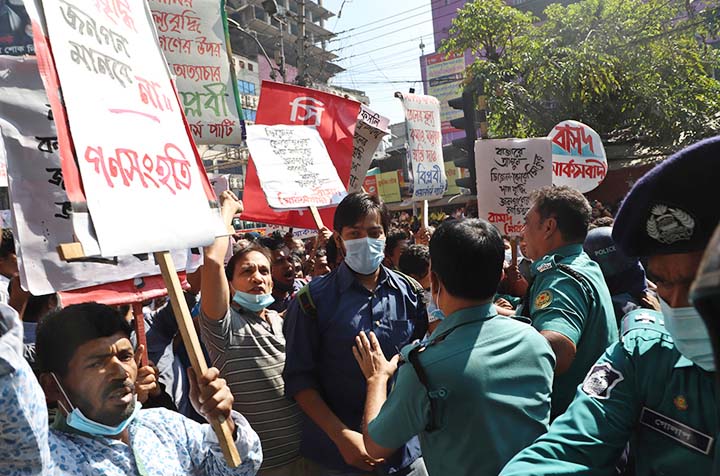 তেলের মূল্যবৃদ্ধির অজুহাতে গণপরিবহনের ভাড়া বাড়ানোর প্রতিবাদে বাম গণতান্ত্রিক জোটের বিদ্যুৎ, জ্বালানি ও খনিজসম্পদ মন্ত্রণালয় ঘেরাও কর্মসূচিতে বাধা দিয়েছে পুলিশ। সোমবার (৮ নভেম্বর) দুপুর ১২টায় জাতীয় প্রেস ক্লাবের সামনে থেকে বিক্ষোভ মিছিল বের করা হয়। এরপর তা পল্টন হয়ে জিরো পয়েন্ট দিয়ে সচিবালয়ের সামনে যেতে চাইলে সেখানেই বাধা দেয় পুলিশ। পরে জিপিও মোড়ে প্রায় আধা ঘণ্টা অবস্থান করেন বিক্ষোভকারীরা। সেখানে সংক্ষিপ্ত সমাবেশ করেন বাম জোটের নেতারা। এ সময় সেখানে তীব্র যানজট সৃষ্টি হয়। এসময় বক্তারা জ্বালানি তেলের দাম বৃদ্ধি ও গণপরিবহনের ভাড়া প্রত্যাহার না করা হলে কঠোর কর্মসূচি দেওয়া হবে বলে হুঁশিয়ারি দেন। সমাবেশে বক্তৃতা করেন বাম গণতান্ত্রিক জোটের নেতা মোশরেফা মিশু, মোজাফফর আহমদ প্রমুখ।