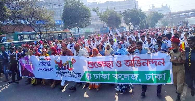 দেশের প্রাচীন বিদ্যাপীঠ ঢাকা কলেজের ১৮০তম প্রতিষ্ঠাবার্ষিকী উপলক্ষে বর্ণাঢ্য র্যালি করেছে কলেজের শিক্ষক-শিক্ষার্থী-কর্মচারীরা। শনিবার (২০ নভে্ম্বর) সকাল ৯টায় কলেজের মূল ভবনের সামনে থেকে এ র্যালি মিরপুর রোডের সায়েন্সল্যাব ও নীলক্ষেত মোড় প্রদক্ষিণ করে আবার কলেজে এসে শেষ হয়। এসময় ঘোড়ার গাড়ি, রঙিন জরি ও বাঁশির শব্দে মুখরিত হয়ে ওঠে পুরো এলাকা। শিক্ষার্থীদের বাঁধভাঙা উচ্ছ্বাসে দীর্ঘদিন পর প্রাণ ফিরে পায় কলেজ ক্যাম্পাস। র্যালিতে উপস্থিত ছিলেন ঢাকা কলেজের অধ্যক্ষ অধ্যাপক আই কে সেলিম উল্লাহ খোন্দকার, উপাধ্যক্ষ অধ্যাপক এ টি এম মইনুল হোসেন, শিক্ষক পরিষদ সম্পাদক ড. আবদুল কুদ্দুস সিকদারসহ কলেজের বিভিন্ন বিভাগের বিভাগীয় প্রধান, শিক্ষক, কর্মকর্তা-কর্মচারীরা। কলেজের ১৮০তম প্রতিষ্ঠাবার্ষিকীর শুভেচ্ছা জানিয়ে অধ্যক্ষ অধ্যাপক আই কে সেলিম উল্লাহ খোন্দকার বলেন, উপমহাদেশের অন্যতম প্রাচীন শিক্ষাপ্রতিষ্ঠান ঢাকা কলেজ। এটি পূর্ববঙ্গ ও আশপাশের এলাকায় শ্রেষ্ঠ প্রতিষ্ঠান হিসেবে শিক্ষা বিস্তার করে আসছে। যখন ঢাকা বিশ্ববিদ্যালয় প্রতিষ্ঠিত হয়নি তখন এটিই ছিল একমাত্র উচ্চ শিক্ষাপ্রতিষ্ঠান। ঢাকা কলেজের বিশেষত্ব হলো ১৮০ বছরেও দেশে শ্রেষ্ঠত্বের আসন ধরে রেখেছে। আশা করি, আগামীতেও এ যাত্রা অব্যাহত থাকবে। তিনি আরও বলেন, ২০৪১ সালে উন্নত-সমৃদ্ধ বাংলাদেশ গঠনের জন্য যে অগ্রযাত্রা, সেখানে শিক্ষা মূল নিয়ামক। সেভাবে শিক্ষার্থীদের গড়ে তুলতে আমরা এখানে নতুন নতুন বিষয়ে অনার্স-মাস্টার্সের উদ্যোগ নিয়েছি। আশা করি আগামীতে নতুন নতুন বিষয়ে পাঠদানের সুযোগ তৈরি করতে পারবো। প্রতিষ্ঠাবার্ষিকী উপলক্ষে পুরো ক্যাম্পাসজুড়ে আলোকসজ্জা করা হয়। সরেজমিনে ক্যাম্পাস ঘুরে দেখা যায়, কলেজের মূল ফটক থেকে শুরু করে প্রশাসনিক ভবন, বিজয় চত্বর, স্বাধীনতা চত্বর, নতুন ভবন, শহীদ মিনার চত্বরসহ দুইপাশের সীমানা প্রাচীর জুড়ে বর্ণিল আলোকসজ্জা। ক্যাম্পাসজুড়ে সাজ সাজ রব। এ সময় শিক্ষার্থীদের দলবেঁধে ঘুরতে আর আনন্দ-উল্লাস করতে দেখা যায়। প্রতিষ্ঠাবার্ষিকী উপলক্ষে প্রশাসনের পক্ষ থেকে দুইদিনের কর্মসূচি হাতে নেওয়া হয়েছে। এ উপলক্ষে ২০ নভেম্বর দুপুর ৩টায় কলেজের মাঠে প্রীতি ফুটবল ম্যাচ, রাত ৮টায় অনুমতি পাওয়া সাপেক্ষে আতশবাজি ফুটানো হবে। এ ছাড়া কলেজের বিভিন্ন সামাজিক ও স্বেচ্ছাসেবী সংগঠনের পক্ষ থেকে প্রদর্শনী স্টল ও আলোচনা সভার আয়োজন করা হচ্ছে।