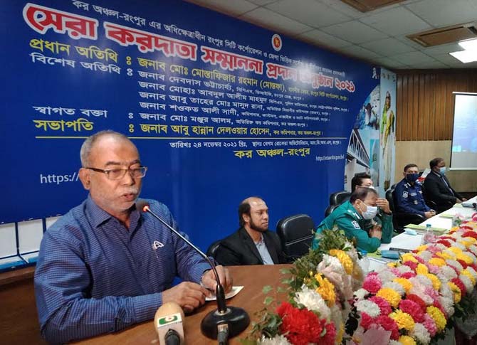 ২০২০-২১ কর বর্ষের সর্বোচ্চ কর প্রদান অনুষ্ঠানে তরুণ সেরা করদাতা রাষ্ট্রিয় সম্মাননা ক্রেস্ট ও সনদ তুলে দেন অনুষ্ঠানে প্রধান অতিথি রংপুর সিটি কর্পোরেশনের মেয়র মোস্তাফিজার রহমান মোাস্তফা।