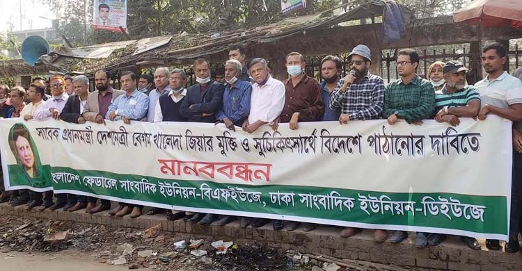 বিএনপি চেয়ারপারসন বেগম খালেদা জিয়ার মুক্তি ও উন্নত চিকিৎসার দাবি জানিয়েছেন বাংলাদেশ ফেডারেল সাংবাদিক ইউনিয়ন (বিএফইউজে) ও ঢাকা সাংবাদিক ইউনিয়নের (ডিইউজে) একাংশের নেতারা। সোমবার (২৯ নভেম্বর) জাতীয় প্রেস ক্লাবের সামনে আয়োজিত মানববন্ধনে বক্তারা এ দাবি জানান। সাংবাদিক নেতারা বলেন, বেগম জিয়া বর্তমানে জীবন-মৃত্যুর সন্ধিক্ষণে। এখন তার যে চিকিৎসা প্রয়োজন তা দেশে সম্ভব নয়। তাই যত দ্রুত সম্ভব খালেদা জিয়াকে বিদেশে পাঠানো উচিত। কিন্তু সরকারের মধ্যে সে ধরনের কোনো সদিচ্ছা নেই। তারা বলেন, সাবেক এই তিনবারের প্রধানমন্ত্রীকে তিলে তিলে হত্যার ষড়যন্ত্র করা হচ্ছে। একজন সম্মানিত ব্যক্তির চিকিৎসা প্রয়োজন, অথচ তাকে নিয়ে এই মুহূর্তে সরকার দলের নেতারা নানা ধরনের বেফাঁস বক্তব্য দিয়ে যাচ্ছেন। একজন অসুস্থ মানুষকে নিয়ে রাজনীতি দেশের জন্য আরও খারাপ পরিস্থিতি বয়ে আনবে বলে মন্তব্য করেন বক্তারা। অবিলম্বে বক্তারা খালেদা জিয়ার মুক্তি দিয়ে বিদেশে উন্নত চিকিৎসার ব্যবস্থা করার দাবি জানান। মানববন্ধনে জাতীয় প্রেস ক্লাবের সাবেক সভাপতি সিনিয়র সাংবাদিক শওকত মাহমুদসহ উপস্থিত ছিলেন বাংলাদেশ ফেডারেল সাংবাদিক ইউনিয়নের সভাপতি এম আব্দুল্লাহ, জাতীয় প্রেস ক্লাবের সাধারণ সম্পাদক ইলিয়াস খান, সিনিয়র সহ-সভাপতি হাসান হাফিজ, বিএফইউজে মহাসচিব নুরুল আমিন রোকন, ঢাকা সাংবাদিক ইউনিয়নের (ডিইউজে) সভাপতি কাদের গনি চৌধুরী, সাধারণ সম্পাদক শহিদুল ইসলাম, সাবেক সাধারণ সম্পাদক জাহাঙ্গীর আলম প্রধান প্রমুখ। বেগম খালেদা জিয়ার লিভার সিরোসিস শনাক্ত হয়েছে বলে জানিয়েছে তার মেডিকেল বোর্ড। গত রোববার রাত ৭টায় বেগম জিয়ার বর্তমান শারীরিক অবস্থা নিয়ে সংবাদ সম্মেলনে এ তথ্য জানান তারা। মেডিকেল বোর্ডের প্রধান প্রফেসর ডা. এফ এম সিদ্দিকী বলেন, বিএনপি চেয়ারপার্সন বেগম খালেদা জিয়ার চিকিৎসার জন্য এ মুহূর্তে যে প্রযুক্তি দরকার তা ভারতীয় উপমহাদেশে নেই। এসব চিকিৎসা যুক্তরাষ্ট্র, যুক্তরাজ্য ও জার্মানিতে সম্ভব। এখনই দেশের বাইরে না নেওয়া হলে আবার রক্তক্ষরণ হলে বন্ধের চিকিৎসা দেশে নেই বলেও জানান তিনি।