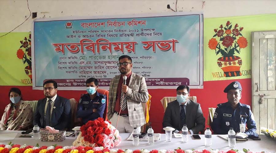 শরীয়তপুর জেলা ডামুড্যা উপজেলা চতুর্থ ধাপে নির্বাচন উপলক্ষে উপজেলায় নির্বাচন অফিসের পক্ষ থেকে ডামুড্যা উপজেলা ইউনিয়ন পরিষদের নির্বাচনের প্রতিদ্বন্দি প্রার্থীদের নিয়ে আচরণ বিধি বিষয়ে মঙ্গলবার (১৪ই ডিসেম্বর) সকাল ১০ ঘটিকার সময় মত বিনিময় সভা সরকারি আব্দুর রাজ্জাক কলেজের ২য় তলা ভবন হলরুমে অনুষ্ঠিত হয়। সভায় প্রধান অতিথি জেলা প্রশাসক মোঃ পারভেজ হাসান। উপজেলা নির্বাহী অফিসার নাহিয়ান আহমেদ এর সভাপত্বিতে অনুষ্ঠানের বিশেষ অতিথি জেলা অতিরিক্ত পুলিশ সুপার সাইফুল রহমান, জেলা নির্বাচন কর্মকর্তা মোঃ জাহিদ হোসেন, উপজেলা সহকারী কমিশনার (ভ‚মি) সবিতা সরকার, ডামুড্যা থানা ওসি শরীফ আহমদ। উপজেলা ইনেন্সট্রাক্টর ফয়জুল করিম এর সঞ্চালনা উপস্থিত ছিলেন উপজেলা রিটানিং অফিসার শেখ আজিজুল রহমান, উপজেলা রিটানিং অফিসার ওবায়েদুর রহমান প্রিজাইটিং অফিসার এইচ.এম গোলাম মোস্তফা প্রমুখ।
