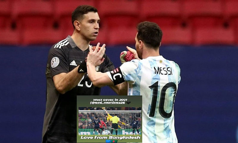 বাংলাদেশে জনপ্রিয়তার তুঙ্গে রয়েছে আর্জেন্টিনা ফুটবল দল। মেসি-ম্যারাডোনার দেশ গত কোপা আমেরিকা জয়ের পর থেকেই এ দেশের মানুষের কাছে জনপ্রিয় হয়ে উঠেছে এমিলিয়ানো মার্টিনেজ নামটি। কোপার সেমিফাইনালে কলম্বিয়ার বিপক্ষে টাইব্রেকারে দুর্দান্ত পারফরম্যান্স করে বাংলাদেশসহ সারা বিশ্বের ফুটবলপ্রেমিদের মন জয় করে নিয়েছেন মার্টিনেজ। টুর্নামেন্টের সেরা গোলরক্ষকের পুরস্কারও জিতেছিলেন তিনি। ইংলিশ ক্লাব অ্যাস্টন ভিলার হয়েও দুর্দান্ত খেলছেন তিনি। সে জন্য জিহাদ নামের এক বাংলাদেশি তার এক পোস্টে মার্টিনেজের ছবি দিয়ে লিখেছিলেন, ‘২০২১ সালে সবচেয়ে বেশি সেভ, এমি মার্টিনেজ।’ মার্টিনেজের প্রতি ভালোবাসার এই পোস্ট দৃষ্টি আকর্ষণ করেছে আর্জেন্টাইন গোলরক্ষকেরও। ইনস্টাগ্রামে জিহাদের এই পোস্ট শেয়ার করে ভালোবাসার জবাব দিলেন মার্টিনেজ। নিজের স্টোরিতে ওই ভক্তের পোস্ট শেয়ার করে মার্টিনেজ লিখেছেন, ‘লাভ ফ্রম বাংলাদেশ।’ সেখানে লাভ ইমোজি ও বাংলাদেশের পতাকার ইমোজিও ব্যবহার করেছেন আর্জেন্টাইন গোলরক্ষক।