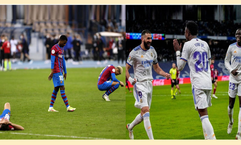 স্প্যানিশ সুপার কাপের এবারের আসর বসেছে সৌদি আরবে। সেই আসরের সেমিফাইনালে বুধবার দিবাগত রাতে মুখোমুখি হয়েছিল চিরপ্রতিদ্বন্দ্বী রিয়াল মাদ্রিদ ও বার্সেলোনা। উত্তেজনায় ঠাসা সেই ম্যাচে বার্সেলোনাকে ৩-২ গোলে হারিয়ে ফাইনালে উঠে গেছে রিয়াল মাদ্রিদ। ম্যাচের ২৫তম মিনিটে দুর্দান্ত এক গোল করে রিয়াল মাদ্রিদকে এগিয়ে দেন ভিনিসিয়াস জুনিয়র। করিম বেনজামার পাস থেকে দুর্দান্ত ফিনিশিং দক্ষতায় গোলটি করেন এই ব্রাজিলীয় তারকা। ম্যাচের ৪১তম মিনিটে বার্সাকে সমতায় ফেরান লুক ডি জং। সমতা নিয়ে বিরতিতে যায় দুদল। বিরতির পর দুটি পরিবর্তন নিয়ে মাঠে নামে বার্সা। ফেরান তোরেসের পরিবর্তে মাঠে নামেন এজালজুলি এবং ডি জং এর পরিবর্তে মাঠে নামেন পেড্রি। বদলি হয়ে নামা পেড্রি প্রথম মিনিটেই গোল পেতে পারতেন। তার বুলেট গতির শট বারপোস্টের বাইরে দিয়ে গেলে বেঁচে যায় রিয়াল। ম্যাচের ৭১তম মিনিটে করিম বেনজামা করলে ২-১ ব্যবধানে এগিয়ে যায় রিয়াল। ৮৩তম মিনিটে হেডে গোল করে বার্সাকে ফের সমতায় ফেরান আনসু ফাতি। শেষ পর্যন্ত নির্ধারিত ৯০ মিনিটে আর কোনো দল গোল করতে না পারলে খেলা গড়ায় অতিরিক্ত সময়ে। ৯৮তম মিনিটে গোল করে রিয়ালকে ফের এগিয়ে দেন ফেডরিকো ভালভার্দে। রোদ্রিগোর অ্যাসিস্ট থেকে গোল করে রিয়ালের লিড এনে দেন তিনি। সেই গোলটি আর পরিশোধ করতে পারেনি বার্সা। ফলে হার নিয়েই মাঠ ছাড়ে জাভির দল।