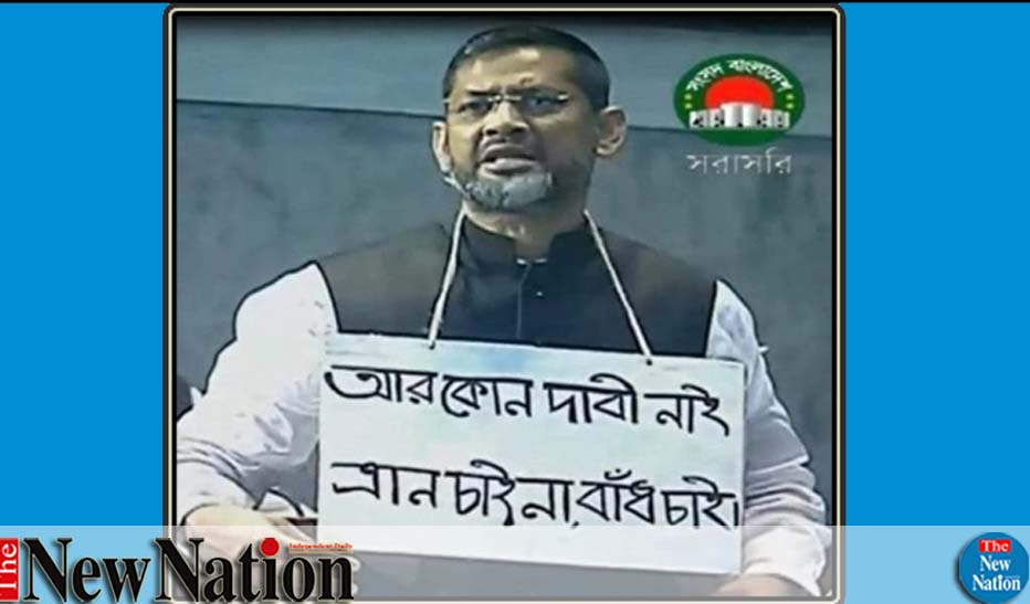 বুধবার (১৬ জুন) জাতীয় সংসদে চলতি বাজেট অধিবেশনে প্রস্তাবিত বাজেটের ওপর আলোচনায় অংশ নেন এই সংসদ সদস্য। বক্তব্যের শেষে নিজের নির্বাচনী এলাকায় উপকূলীয় অঞ্চলে চরগুলোতে বাঁধ নির্মাণের দাবি করে গলায় প্ল্যাকার্ড ঝুলিয়ে স্পিকারের দৃষ্টি আকর্ষণ করেন। তার প্ল্যাকার্ডে লেখা ছিল—‘আর কোনো দাবি নাই, ত্রাণ চাই না বাঁধ চাই’।