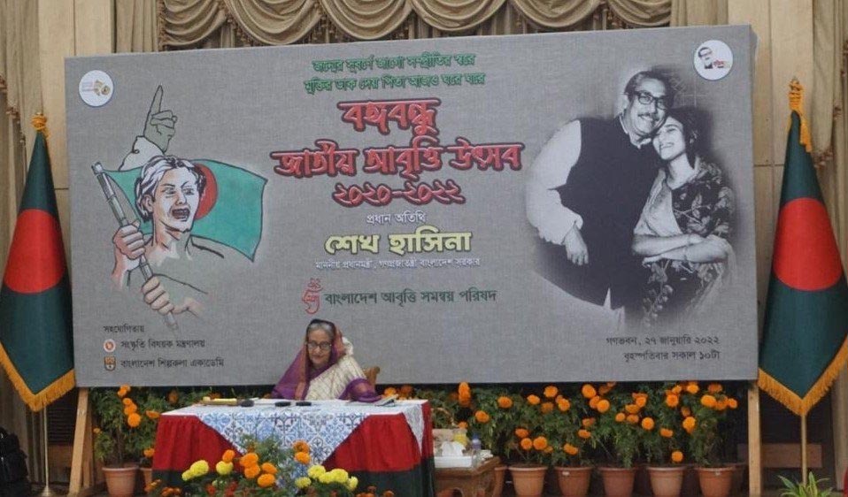 বৃহস্পতিবার বঙ্গবন্ধু জাতীয় আবৃত্তি উৎসব ২০২০-২২ এবং বঙ্গবন্ধু শেখ মুজিব জাতীয় আবৃত্তি পদক ২০২০-২২ প্রদান অনুষ্ঠানে প্রধান অতিথির বক্তব্যে প্রধানমন্ত্রী এ কথা বলেন।