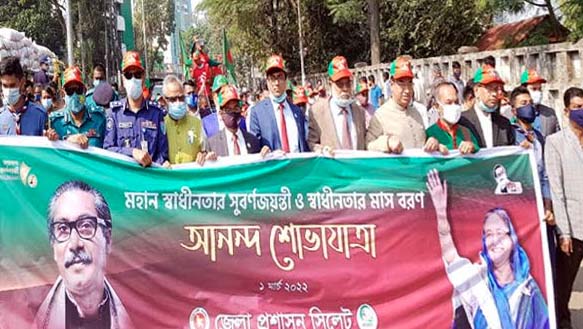 সিলেটে আনন্দ শোভাযাত্রার মধ্য দিয়ে বরণ করা হয়েছে মহান স্বাধীনতার সুবর্ণজয়ন্তী ও স্বাধীনতার মাস বরণ মার্চকে।