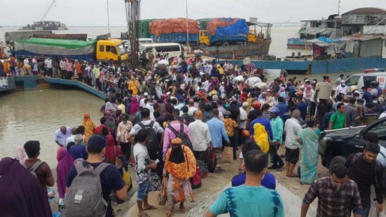 সারাদেশে কঠোর লকডাউনের সরকারি ঘোষণা আসার পর ঢাকা ছাড়তে মানুষের ঢল নেমেছে শিমুলিয়ায় ফেরি ঘাটে। সকাল ১০টায় ঘাট এলাকায় ঘরে ফেরা মানুষের ভিড়ের কারণে পা রাখার ঠাঁই ছিল না। স্বাস্থ্যবিধির তোয়াক্কা না করে যাত্রীরা নদীর স্রোতের মতো বাড়ি ফিরছেন।