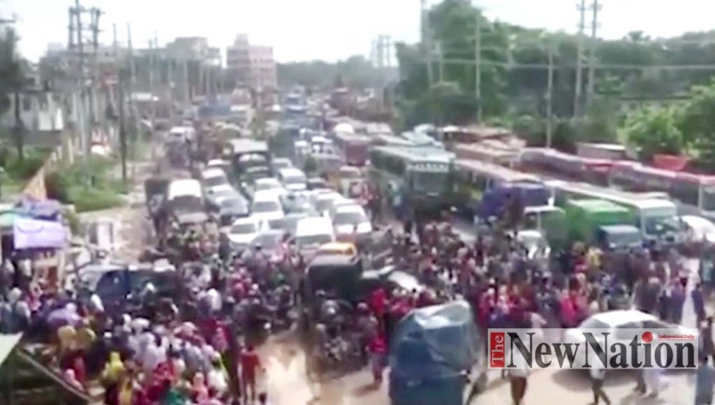 সোমবার (২৮ জুন) সকাল ৮টার দিকে ঢাকা-আরিচা মহাসড়কের রেডিওকলোনি এলাকায় সড়ক অবরোধ করে বিভিন্ন পোশাক কারখানার অপেক্ষারত শ্রমিকরা।