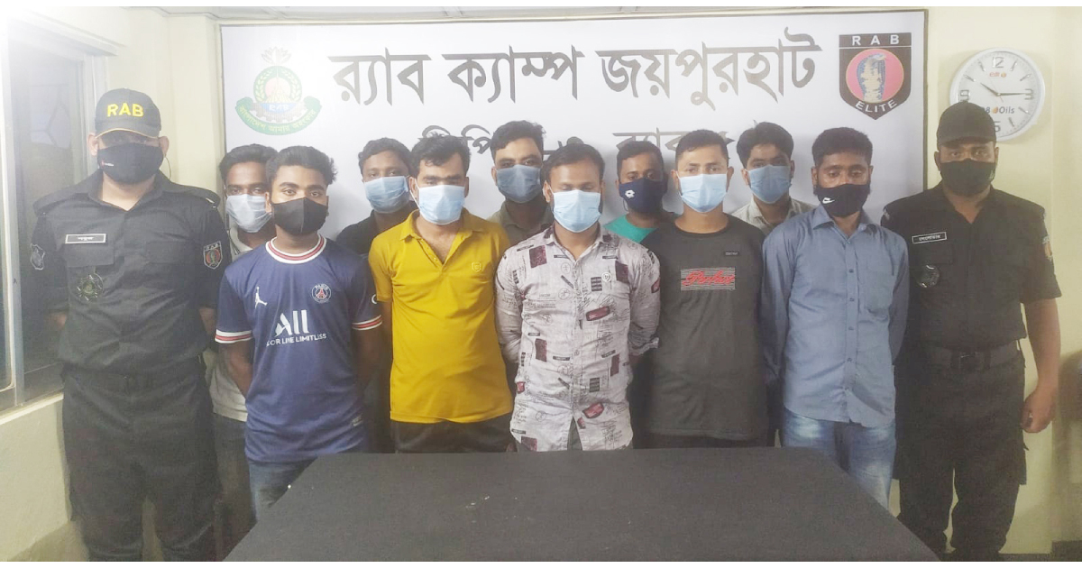 গ্রেপ্তার ব্যক্তিরা হলেন- সাপাহার উপজেলার বাহাপুর গ্রামের নুর আলম (৩৫), মদনসিং গ্রামের সাকিব হাসান (২৯), পিছল মধ্যপাড়া গ্রামের ইমরান (২২), মানিকুড়া গ্রামের কামাল হোসাইন (২৩) ও আরিফুল ইসলাম(২৭), জয়পুর গু চ্ছগ্রামের শাহিন আলম (২৬), খুদ রামবাটি (মহিলিপুর) গ্রামের মতিউর রহমান (২৮), সৈয়দপুর গ্রামের রাশেদ মিলন (২৮), বৈদ্যপুর গ্রামের আব্দুল মাজেদ (২৮) এবং সাড়াইডাঙ্গা গ্রামের কাওসার মাহমুদ শান্ত (২৮।