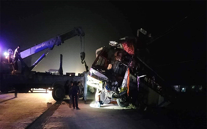 স্থানীয় মোকামতলা পুলিশ তদন্ত কেন্দ্র জানায়, রুপা পরিবহনের একটি বাস মহাসড়কের পশ্চিম পার্শ্বে বৈদ্যুতিক খুটির সঙ্গে ধাক্কা খেয়ে উল্টে খাদে পড়ে যায়। এসময় বাসের নিচে চাপা পড়ে একজন নিহত ও অন্তত ১৫ জন আহত হন।