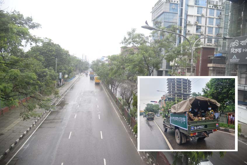 পুলিশ বিভিন্ন চেকপোস্টে মোটরসাইকেল ও ব্যক্তিগত গাড়ি থামিয়ে জিজ্ঞাসাবাদ করছে। জরুরি প্রয়োজনে অনেকে বের হয়েছেন। এছাড়াও শিল্পকারখানা, ব্যাংক, গণমাধ্যমসহ বিভিন্ন প্রতিষ্ঠানের কর্মীদের প্রতিষ্ঠানের যানবাহনে অথবা পরিচয়পত্র নিয়ে বের হতে দেখা গেছে। বেসামরিক প্রশাসনকে সহায়তার জন্য রাজধানীর রামপুরা ও হাতিরঝিল এলাকায় সেনাবাহিনীর টহল দেখা গেছে।