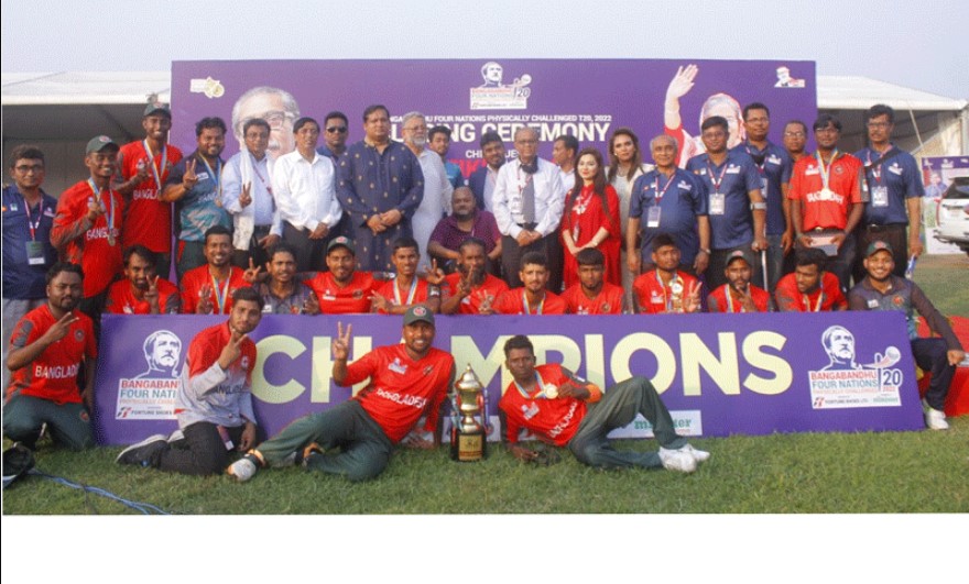 বঙ্গবন্ধু চার জাঁতি ফিজিক্যালি চ্যালেঞ্জড টি-টোয়েন্টির শিরোপা জিতল স্বাগতিক বাংলাদেশ। গতকাল বৃহস্পতিবার কক্সবাজারের শেখ কামাল স্টেডিয়ামে ফাইনালে ভারতকে ৯ উইকেটে হারিয়ে চ্যাম্পিয়ন হয়েছে বাংলাদেশ। টস জিতে ব্যাট করতে নেমে ৭ উইকেট হারিয়ে ১০৮ রান সংগ্রহ করে ভারত। সর্বোচ্চ ৩৮ রান করেন গুলামদিন। এ ছাড়া শচীন ২৪, শিভা ২৩ ও কৈলাশ করেন ২১ রান। বাংলাদেশের বোলার ভোবেন নেন ২ উইকেট। ১০৮ রানের লক্ষ্য নিয়ে মাঠে নেমে ১১ ওভার ১ বলেই লক্ষ্যে পৌঁছে যায় টাইগাররা। ৩২ বলে ৬০ রান করে দলের জয়ে বড় অবদান রাখেন ওপেনার কাজল। ২৬ রানে অপরাজিত ছিলেন অধিনায়ক সুমিত। ১৩ রানে অপরাজিত থাকেন জাভেদ। টুর্নামেন্টের সমাপনী অনুষ্ঠানে ভার্চুয়ালি প্রধান অতিথি হিসেবে উপস্থিত ছিলেন প্রধানমন্ত্রী শেখ হাসিনা। ফিজিক্যালি চ্যালেঞ্জড ক্রিকেট দলের জন্য ১০ কোটি টাকার ফান্ড গঠনের ঘোষণা দিয়েছেন দেশনেত্রী শেখ হাসিনা। চ্যাম্পিয়ন বাংলাদেশ দলের প্রত্যেক সদস্যকে পাঁচ লাখ টাকা করে পুরস্কারের ঘোষণা দিয়েছেন তিনি।